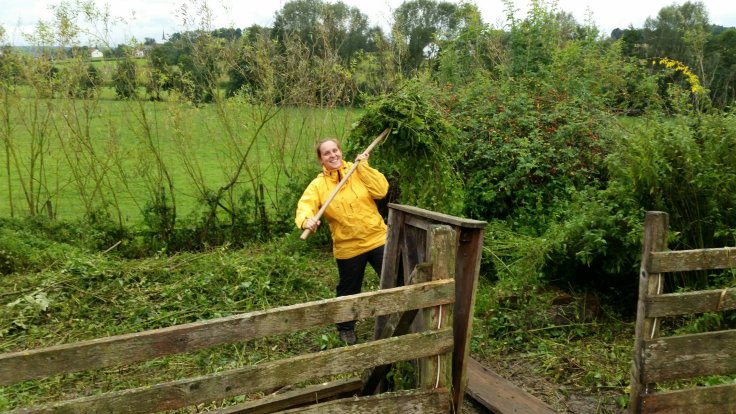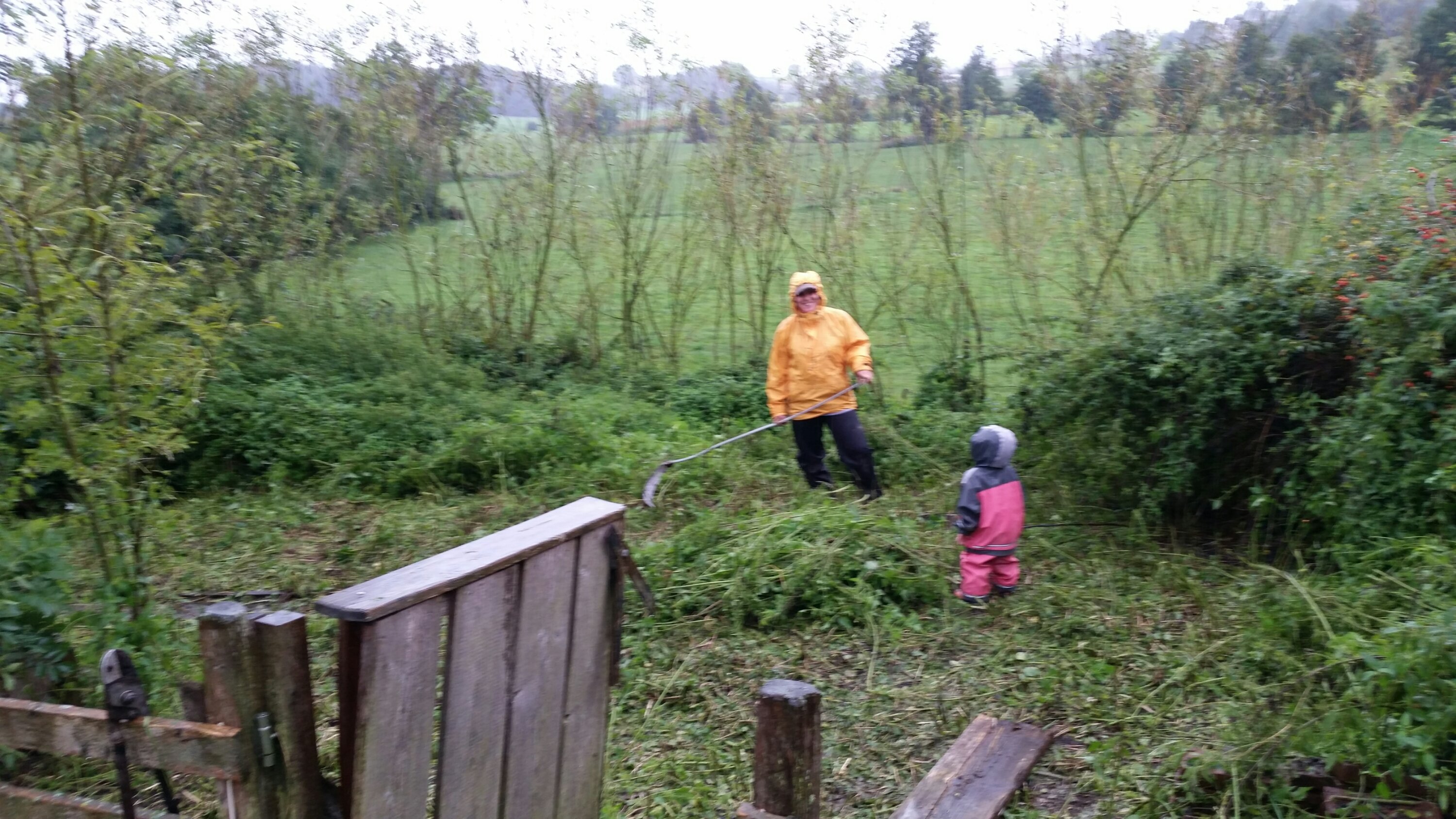 Meine Güte. Was eine Schufterei. Absäbeln – Rechen – Häufen – wegfahren. Und das hundertmal. Und mit Brennesseln. Und zwischendurch taucht ein Stein auf. Oder ein Zaun. Das merkt man dann schmerzlich wenn man mit dem Säbel dagegen donnert.