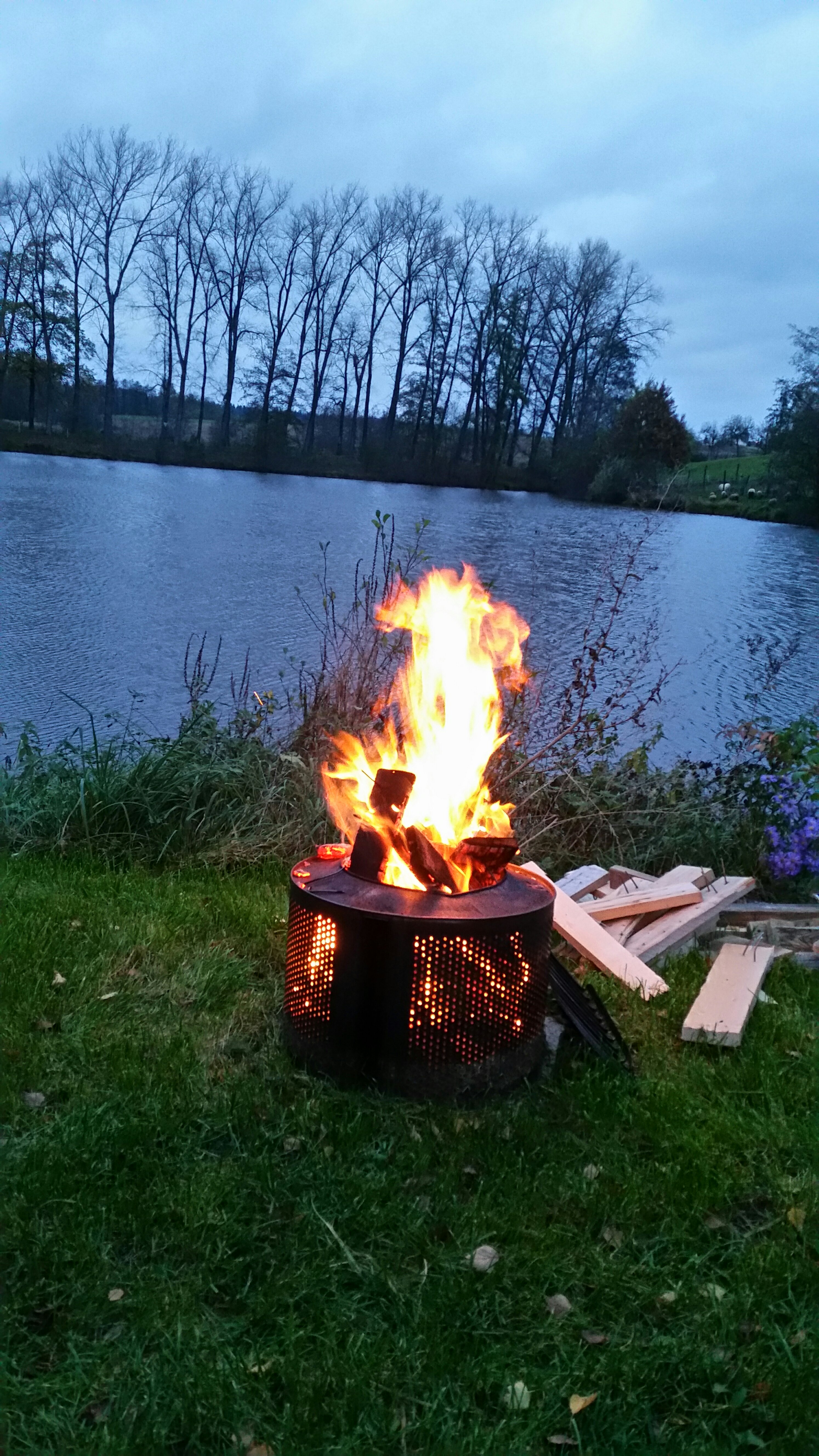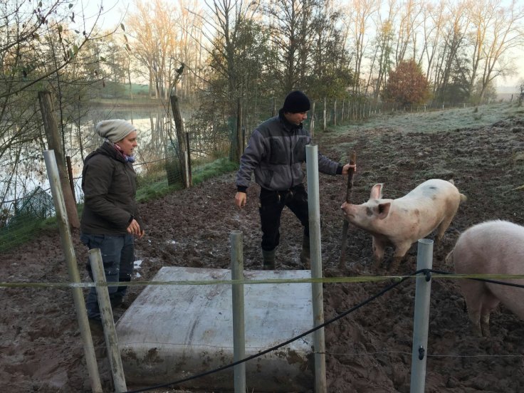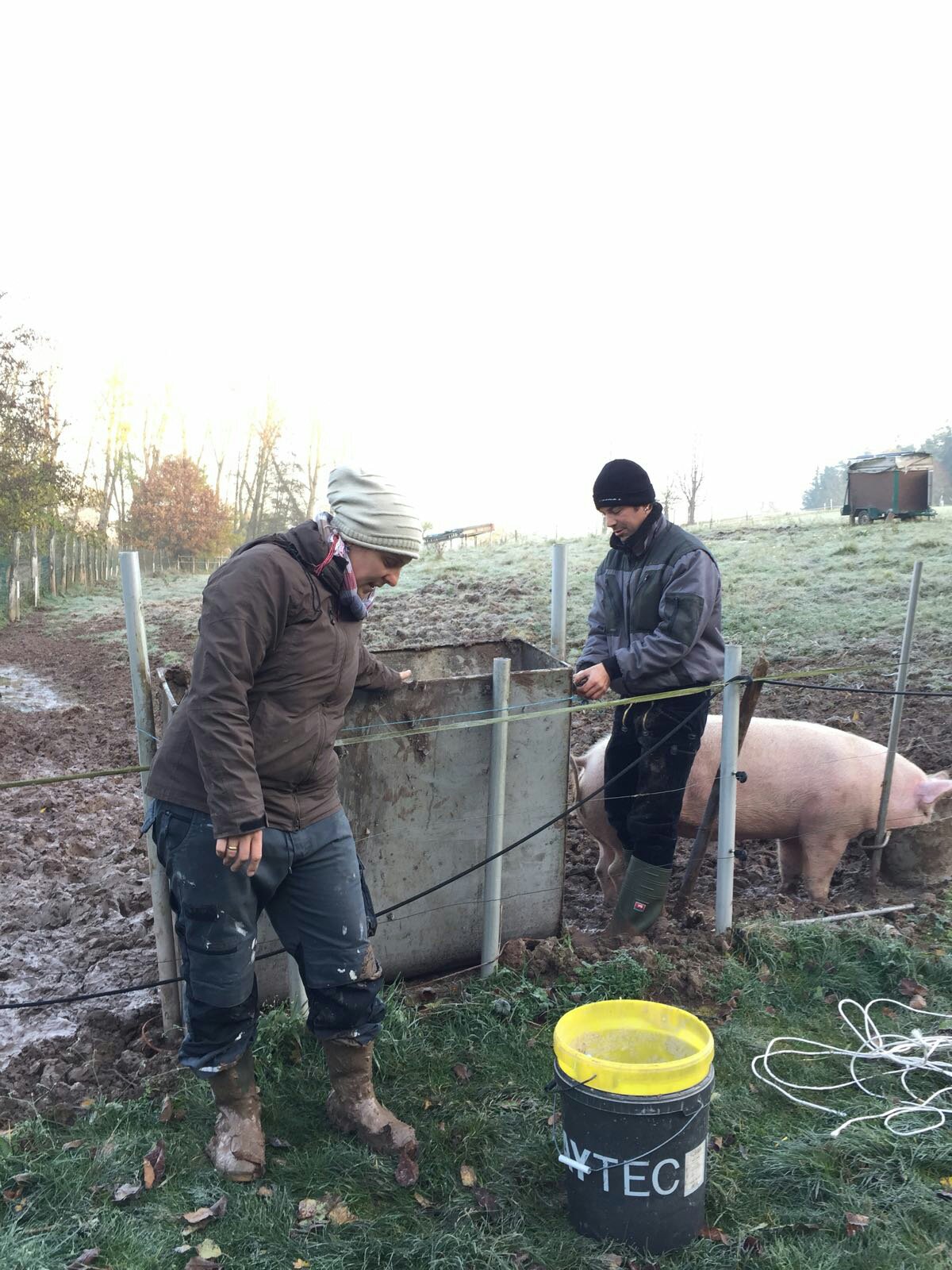 Das Beste hab ich für den Schluss aufgehoben…Heute morgen haben wir gesehen, dass der Schweinetrog umgefallen ist. Phil und ich sind also ins Gehege gestiegen…