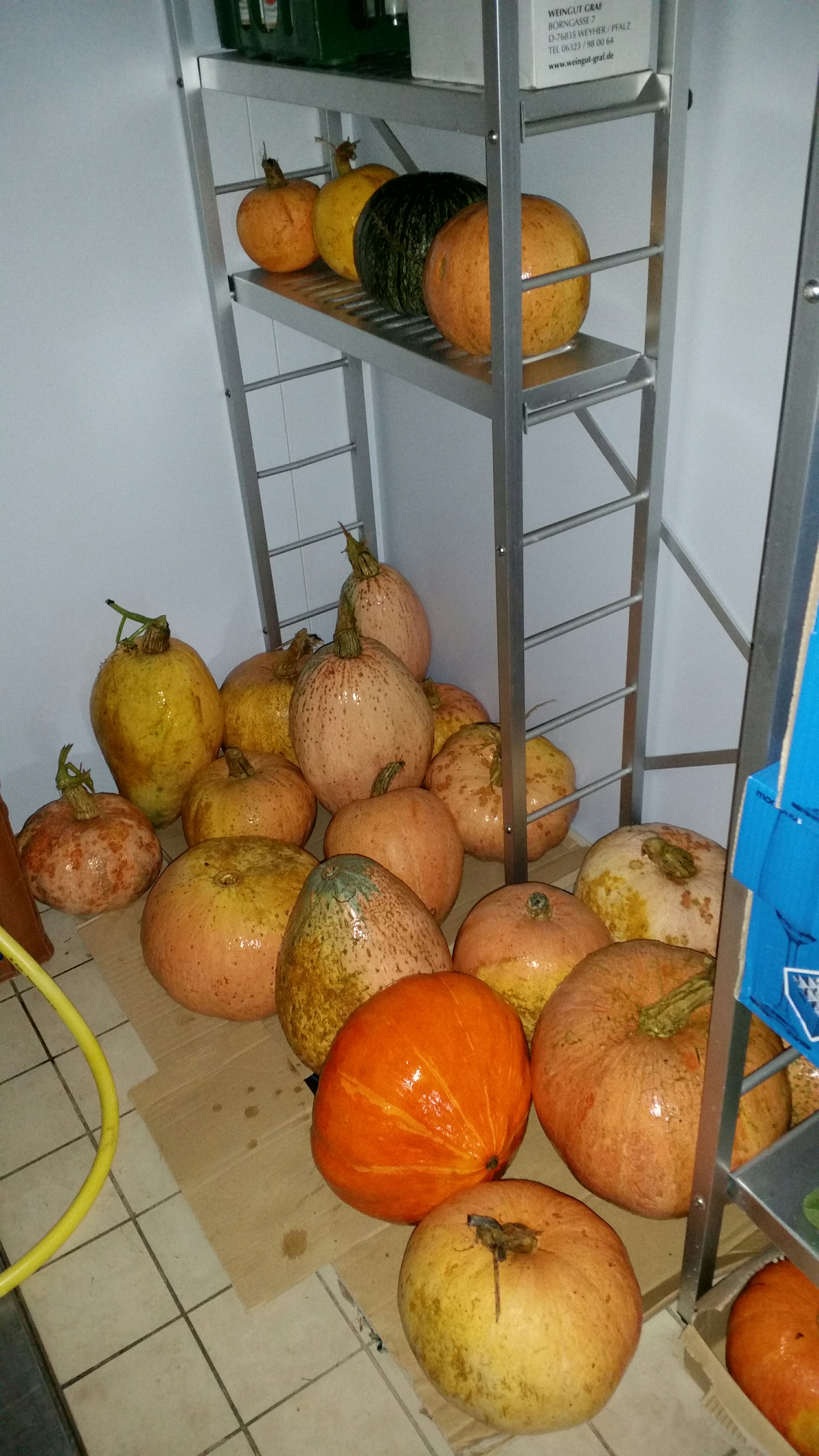 Heute Nacht war der erste Frost da. Das heißt schnell alle Kürbisse ernten, die mögen es nämlich nicht so kalt. Gott sei Dank hatte ich Hilfe. Denn die Oschis mussten nicht nur aus dem Gemüsegarten geholt werden, sondern auch geputzt und verräumt werden.