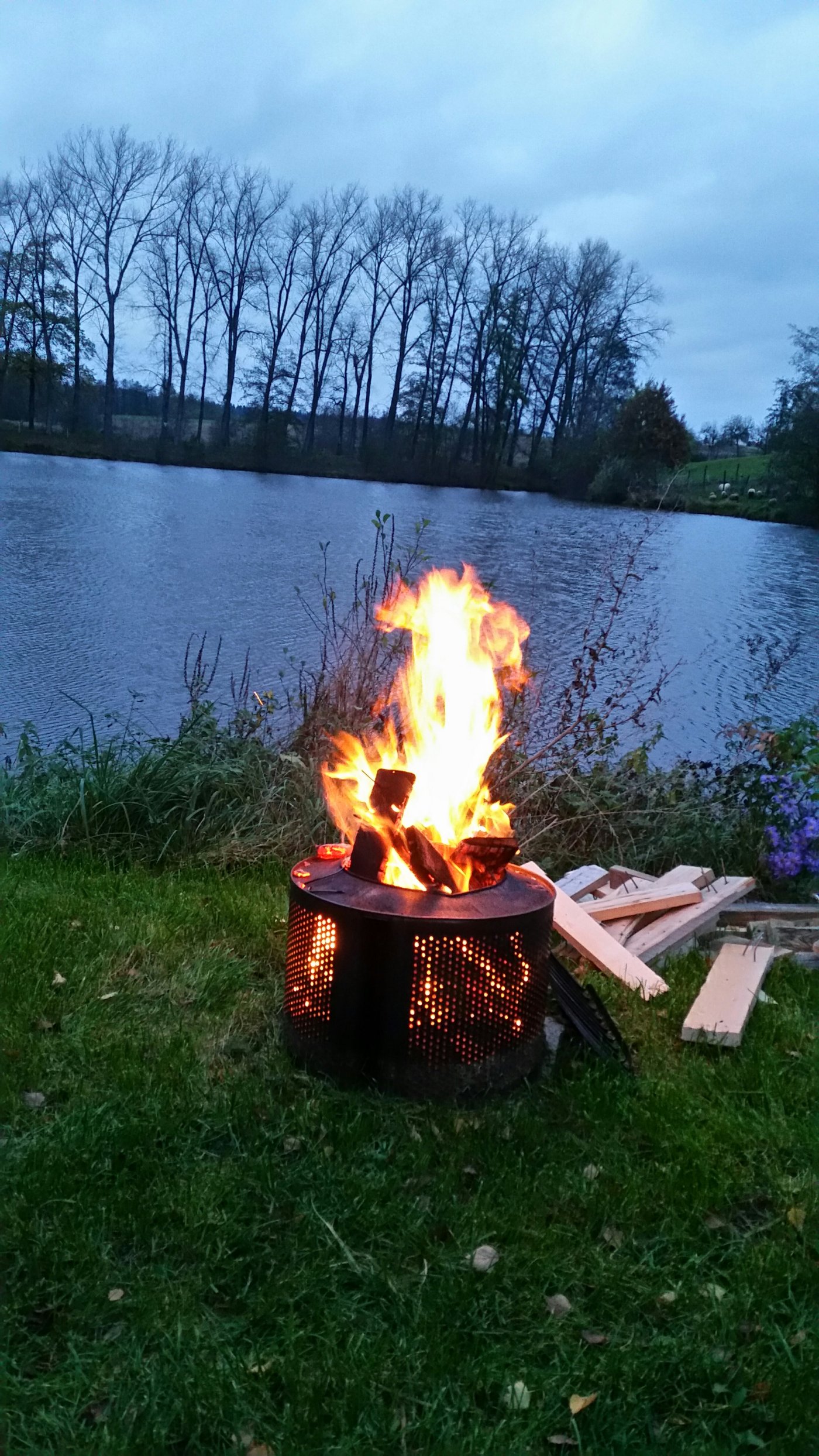 Es ist kalt. Es windet. Egal. Mach mer n Lagerfeuer. Schließlich haben wir den Kindern Stockbrot versprochen. Die Stimmung kommt trotzdem auf. Feuer, See und Schafe 😅 was will man mehr?
