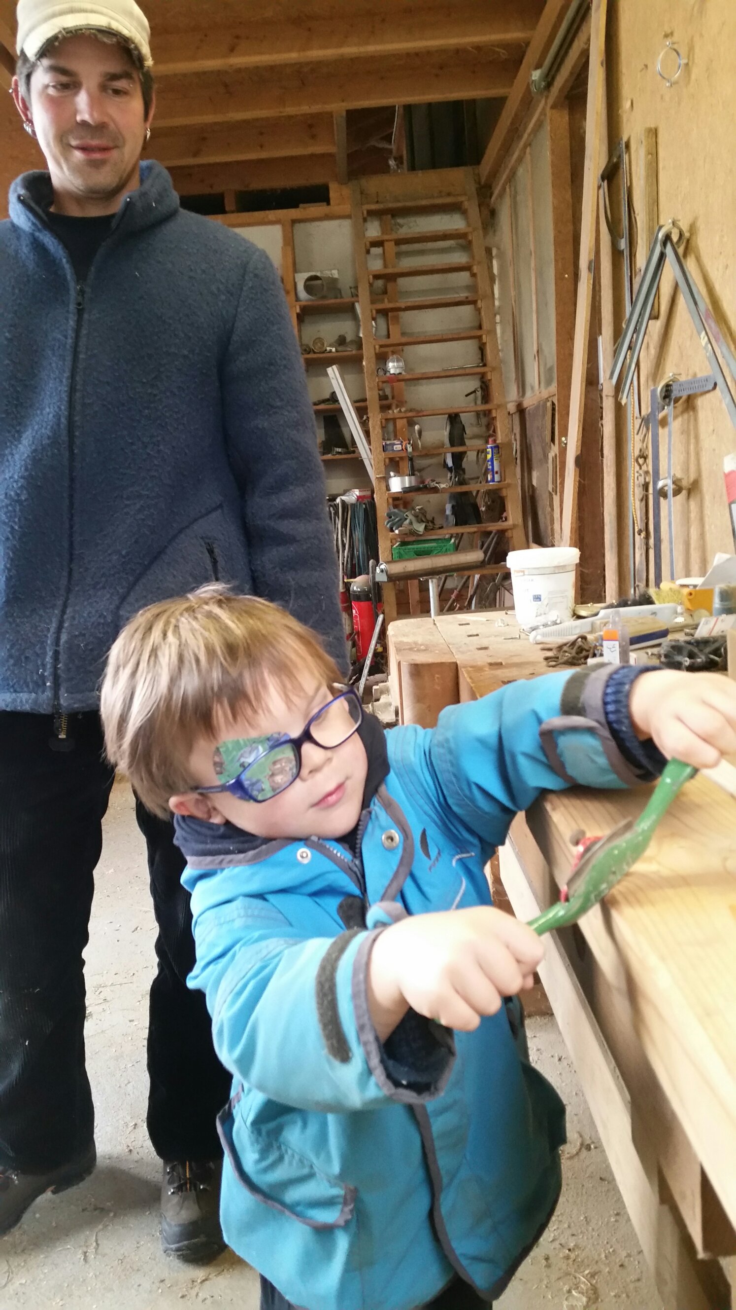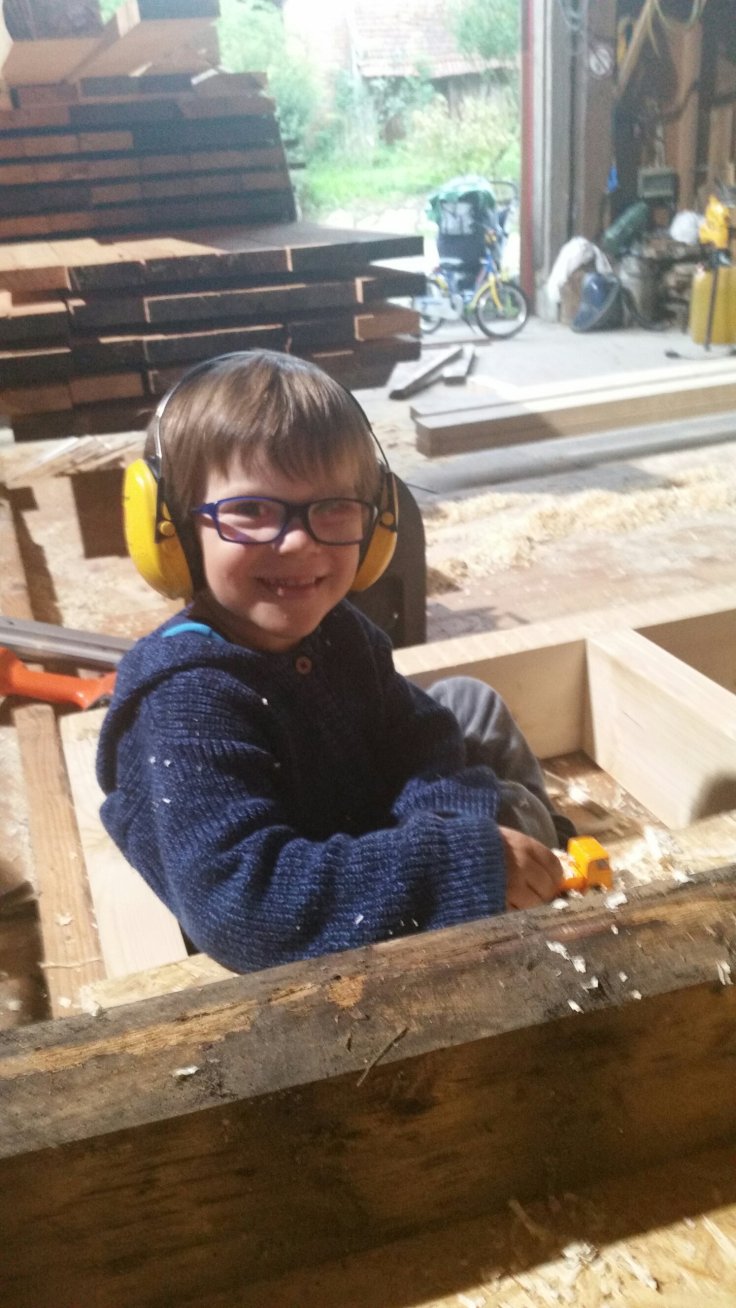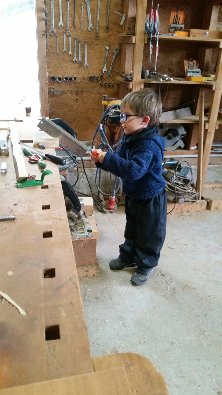gestern war unser Werkstatt-Tag. Also eigentlich Phils. Aber da hat sich dann die ganze Familie eingeklinkt. Zunächst durfte Fynn mal ein bisschen sägen und hobeln, er meinte passend: „jetzt bin ich auch ein Schreiner,Papa!“