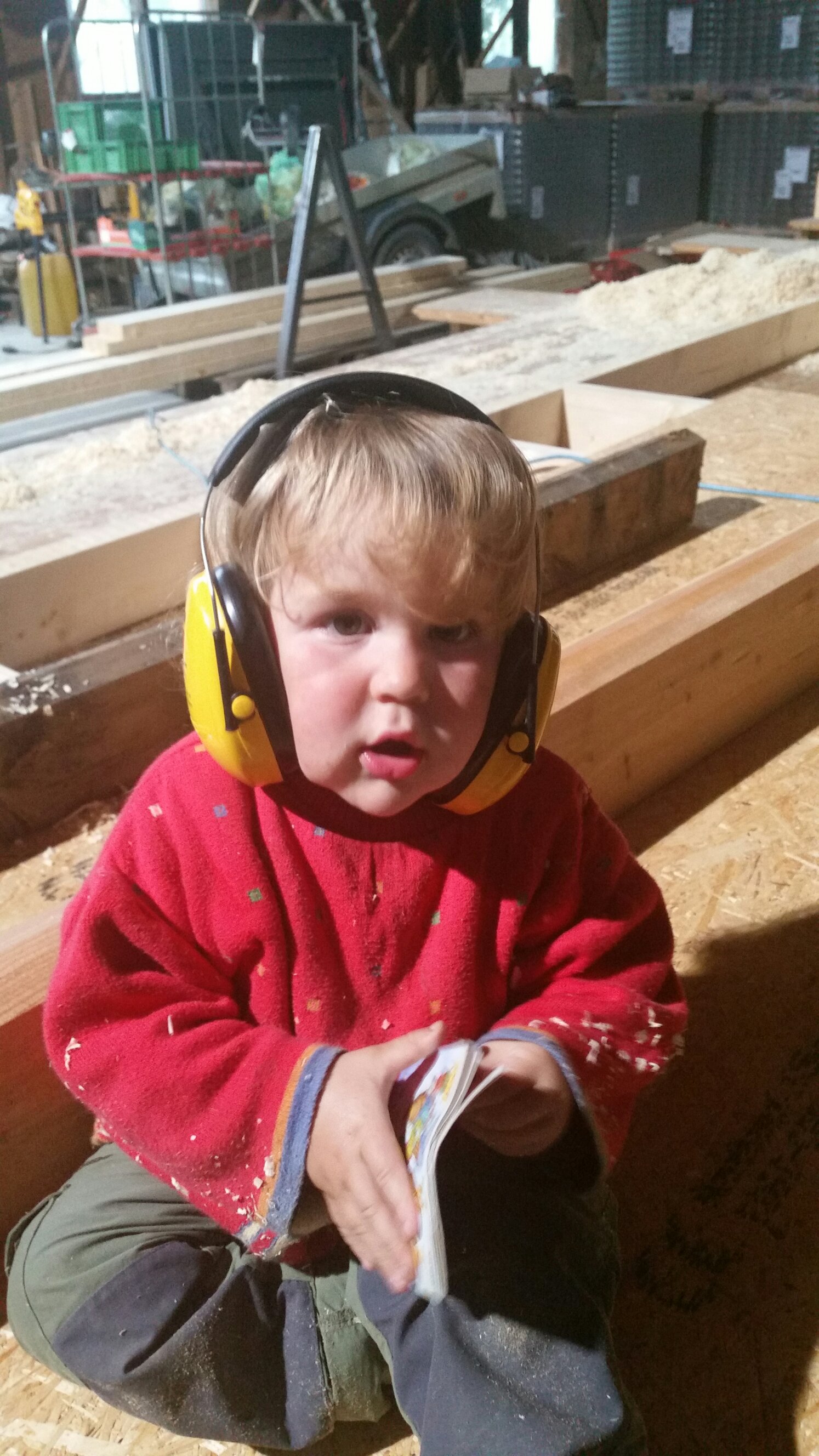 Am Nachmittag kam der Holznachschub für die Veranda. Das bedeutet 22 Balken grob zusägen, die Kanten fasen und nochmal auf Maß sägen. Da wirds laut. Vorbildlich tragen wir alle die Mickey-Maus-Kopfschützer