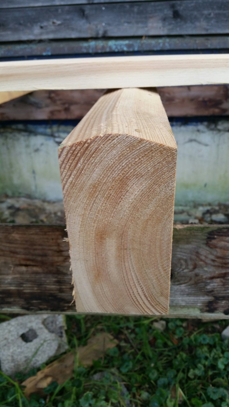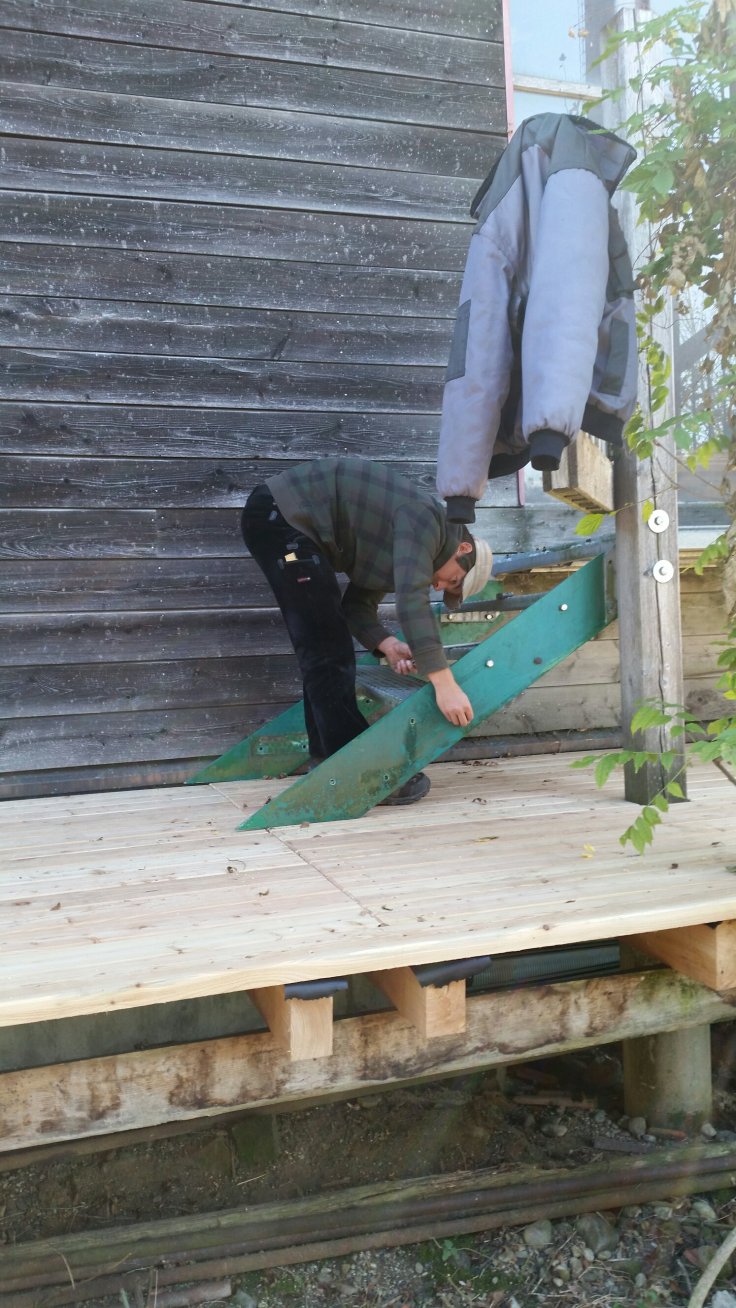 In der Halle vom Michael steht z.B. eine große Hobelmaschine, in die muss man die Bretter nur reinschieben und auf der anderen Seite kommen sie gehobelt wieder heraus 😉. Die langen Bretter konnten wir nicht in der Hobelmaschine hobeln, da der Platz nicht ausreichend war. Also machen wir es wie der Zimmermann und bringen die Maschine zum Material. Alles gehobelt, gefast und ne Kante gemacht für den Regenablauf…Dann kann es ja losgehen.