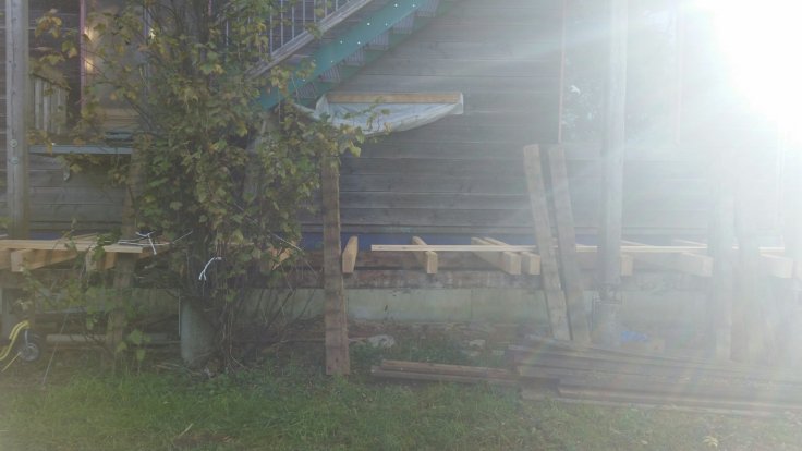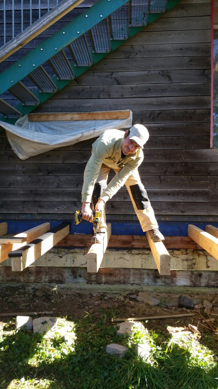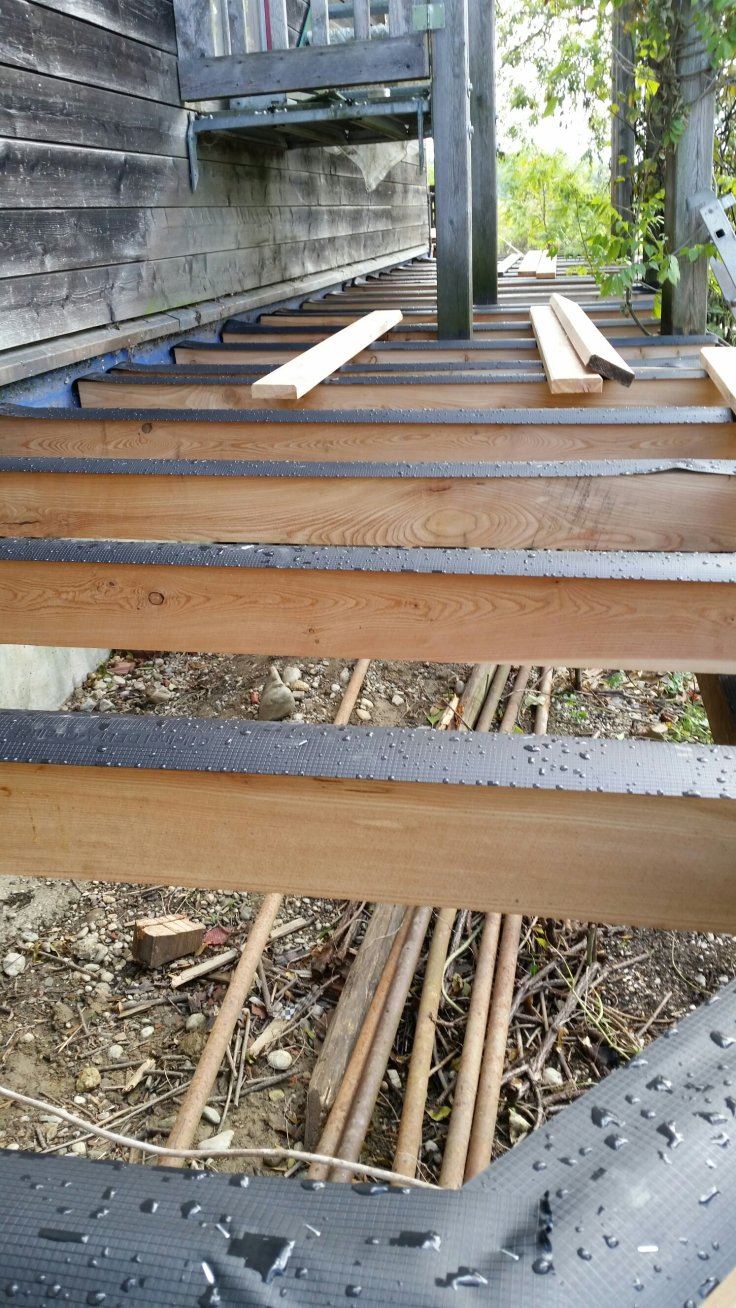 Die Balken haben wir schon mal hingelegt. Das Grundgerüst konnte stehen bleiben 23 Balken davon angeschrägt, damit der Regen besser abläuft (und das nur für de vorderen Teil der Veranda)Abstände messen, damit die Bretter auch auf den Balken aufliegenZusätzlich zum Anschrägen noch ne Folie, so halten die Balken längerEin paar kleine SchraubenWie der Schreiner kann es eben keiner 😁