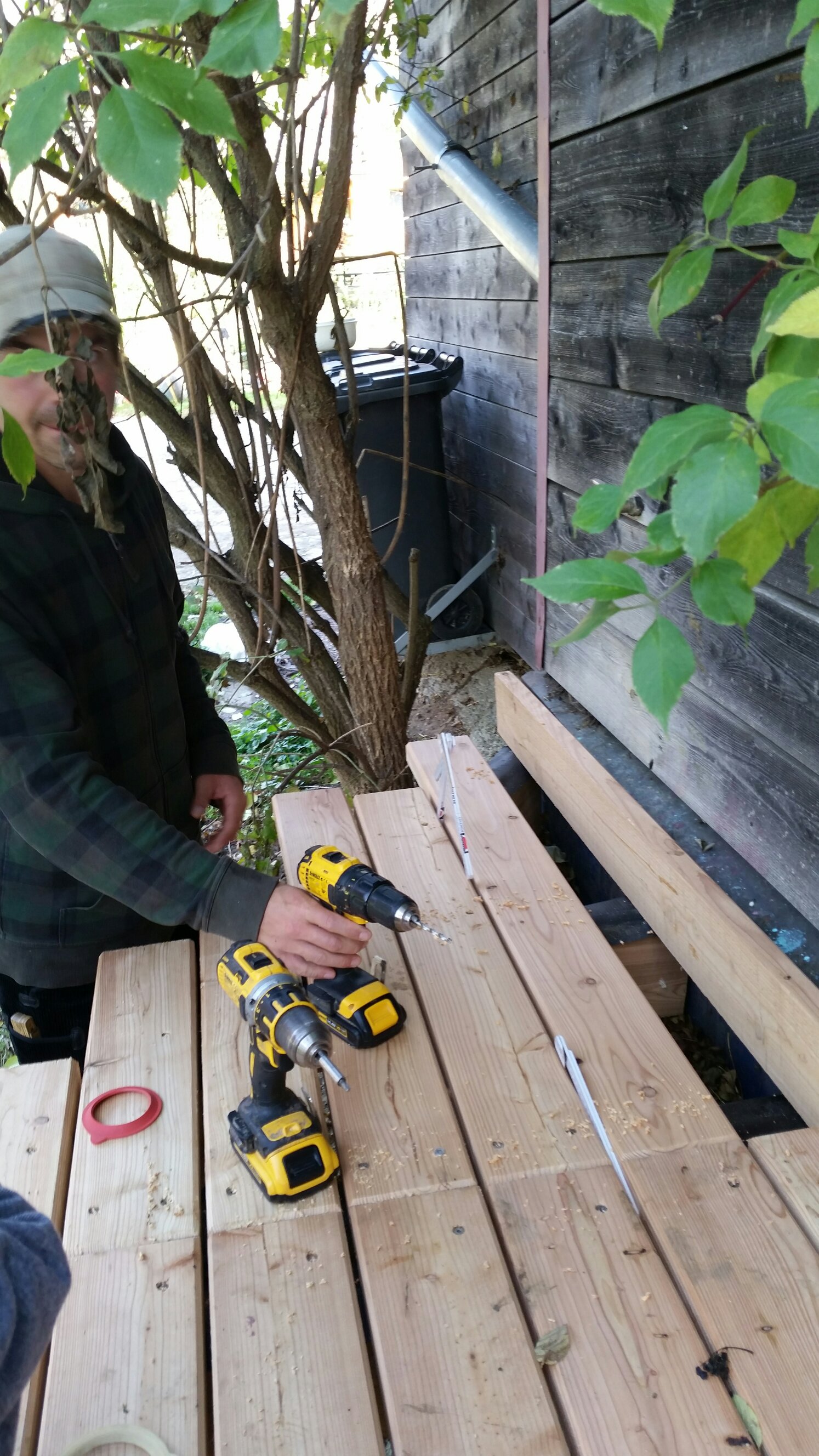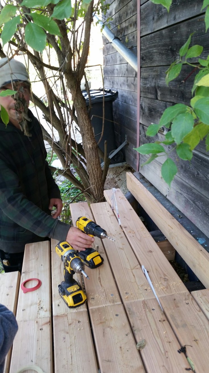 Also so ne große Veranda ist echt enorm viel Arbeit! Phil hat es ausgerechnet: Für die komplette Terssse sind es ca. 1100 Schrauben, die es zu vesenken gilt. Und dabei ist es mit reindrehen gar nicht getan; erst muss man ein Loch bohren, dann für den Schraubenkopf ein Senkloch fräsen und schließlich die Schraube mit viel Kraft reinschrauben. Warum das alles? Damit das Holz zum einen nicht einreißt und zum anderen damit die Schraube ebenerdig mit dem Brett ist. Praktisch. Zwei oder drei Akkuschrauber, dann muss man nicht ständig den Aufsatz wechseln
