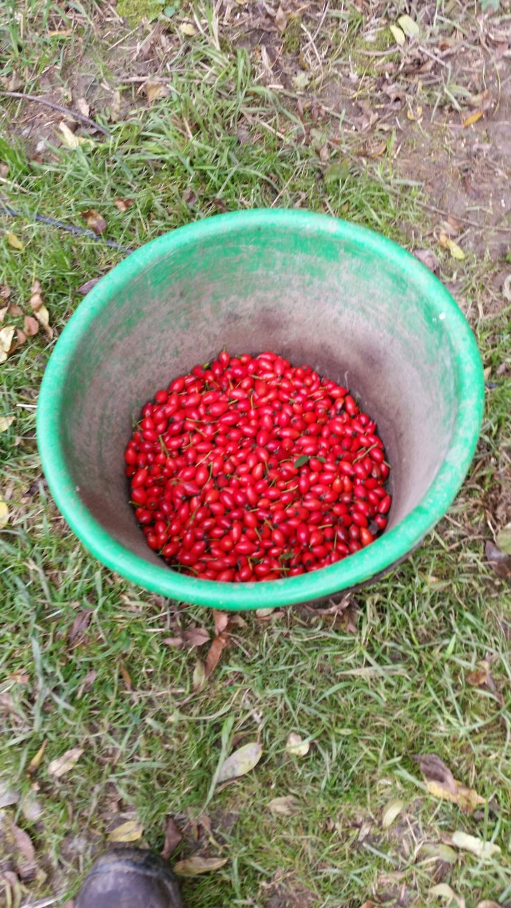 Das ist vielleicht ein undankbares Geschäft. Zum Einen sind die Früchte winzig und es dauert ewig bis sich der Eimer füllt. Zum Anderen gehen sie nicht gerade leicht vom Strauch ab. Mal ganz abgesehen davon, dass man auch noch von den Dornen gepiekst wird. Mein Ertrag nach fast einer Stunde 😣