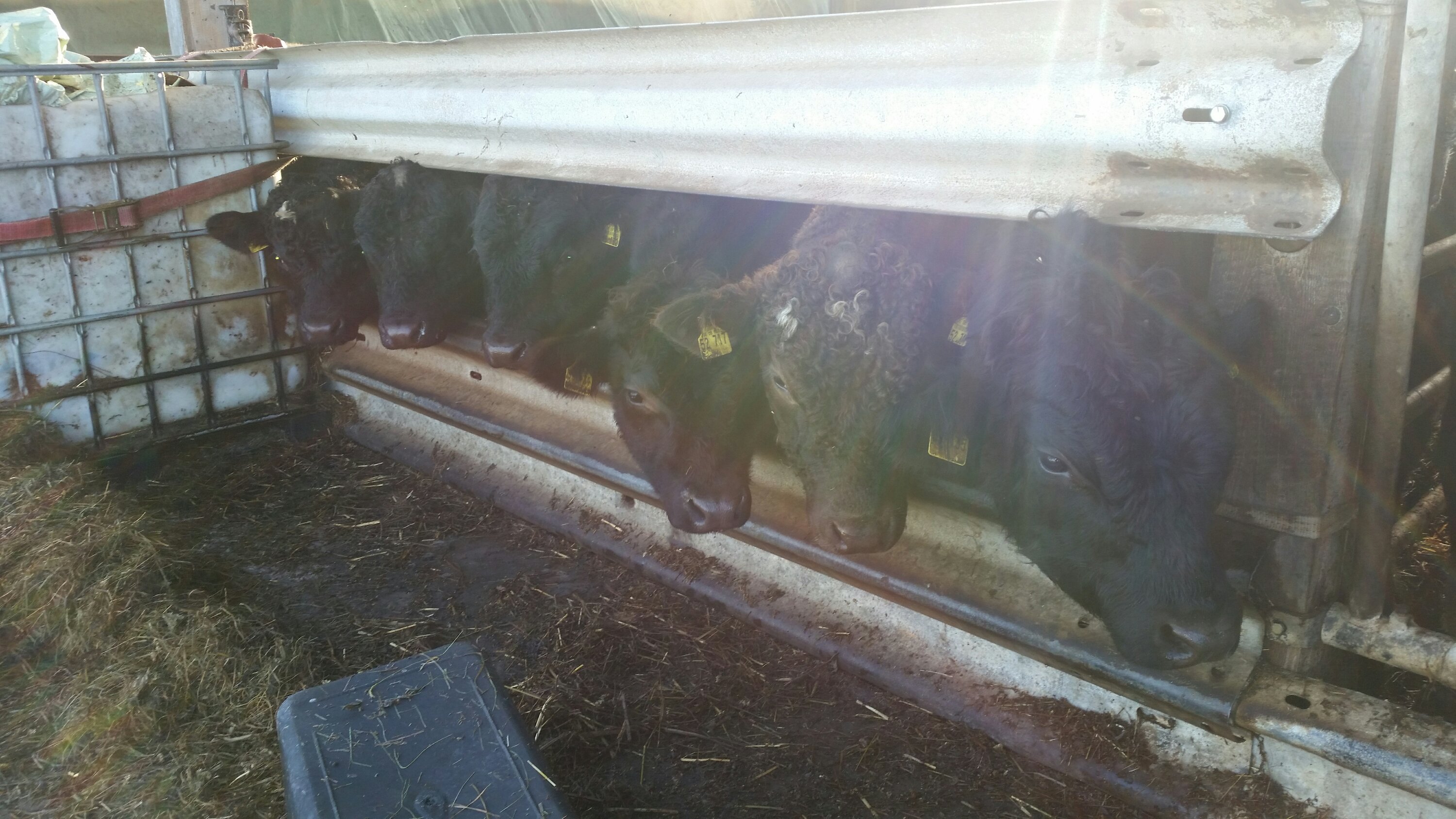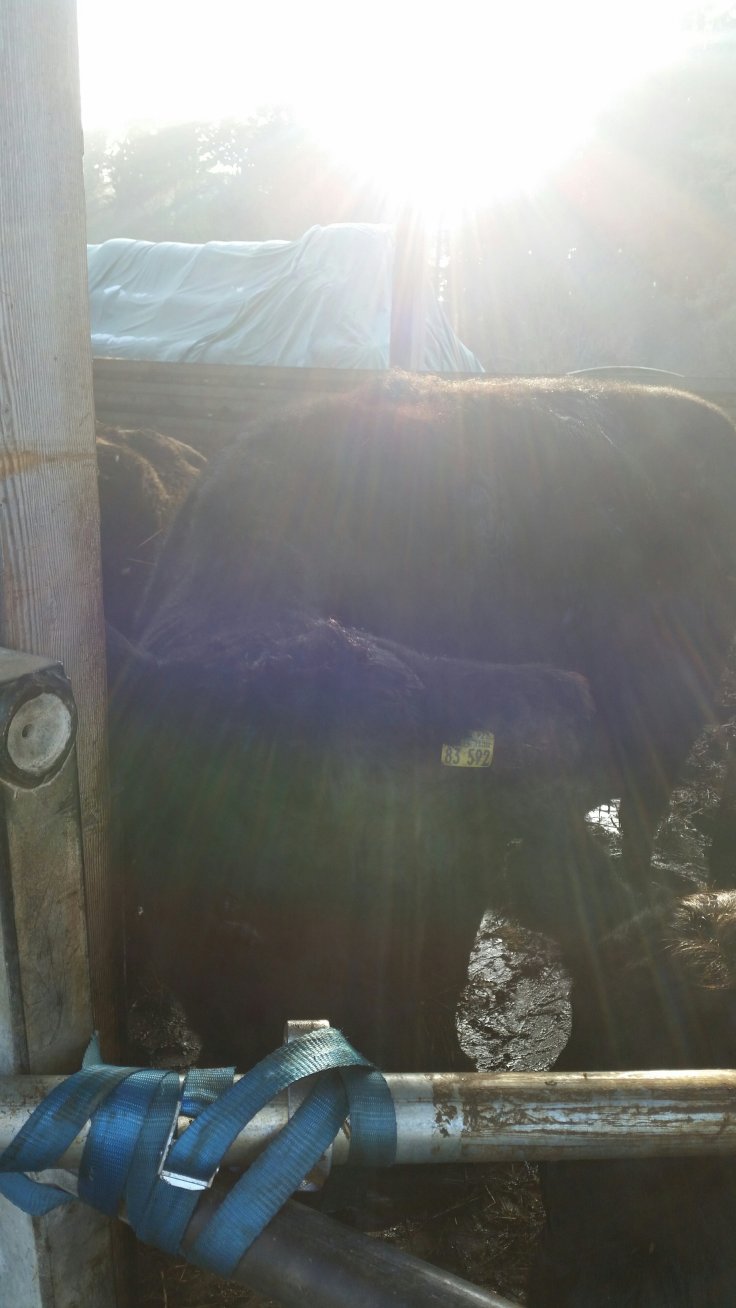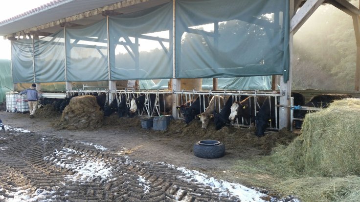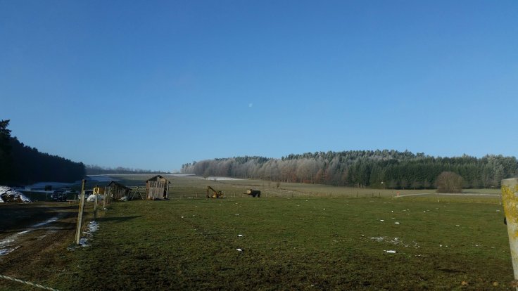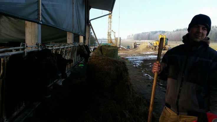 Der Hof ist „Bioland“ zertifiziert und züchtet die hübschen Angus-Rinder. Der Stall und die Weiden befinden sich etwas außerhalb. Momentan ist es ein Provisorium, da, dramatischer Weise, letztes Jahr im Sommer, der komplette Stall samt Schleppern angebrannt ist. Das ist wirklich ein herber Schicksalsschlag. Doch nun geht es voran. Nach den Diskussionen mit Versicherung und Co. beginnt der Neuaufbau.