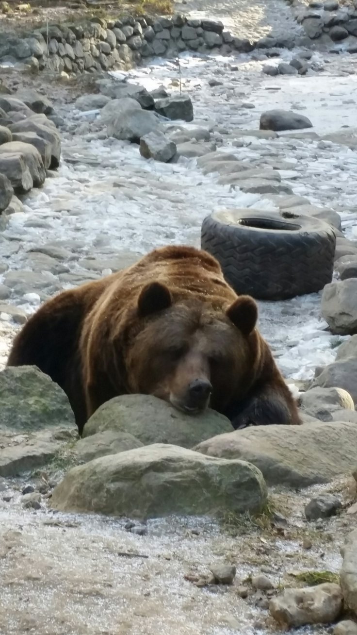 Frisch aufgewacht aus dem Winterschlaf. Sein Bruder pennt noch 😅. Sein Blick wirkt noch sehr müde. Das Bild ist innerhalb entstanden. Aber man konnte den Bären auch von draußen sehen.