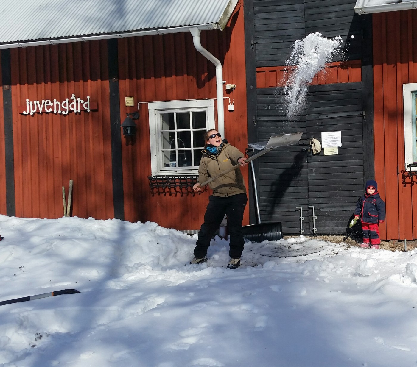 Auch Frau kann schaffen. Einmal Dach räumen bitte. Sonst kommt das wie eine Lawine da runter. Praktisch ist der ausfahrbare SchneeschieberUnd es fliegt der Schnee. Vor dem Café wird geräumt, da soll es nun auch mal tauen. Es sind schon richtige Eisschichten,die wir vorher losklopfen mussten